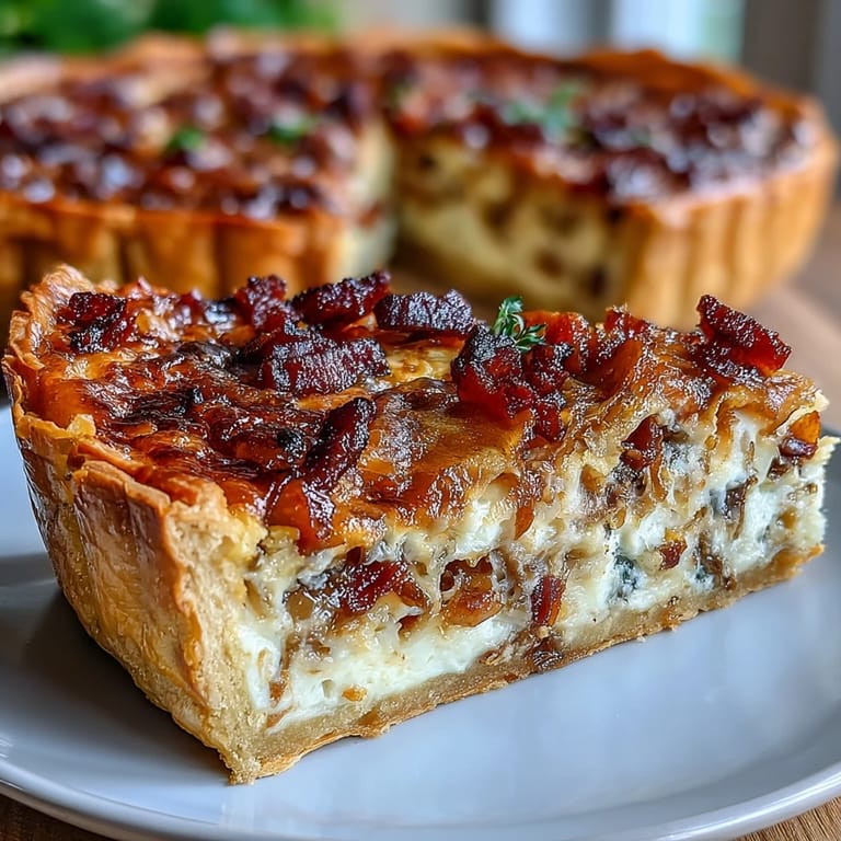 A quiche sits in this beautiful middle ground between elegant and casual, which means it works for Sunday brunch with linen napkins or a Tuesday night dinner with no fuss at all. The protein from bacon and eggs, the carbs from the crust, and the vegetables from the onions make it genuinely filling without feeling heavy—serve it with a crisp green salad and nobody will complain.