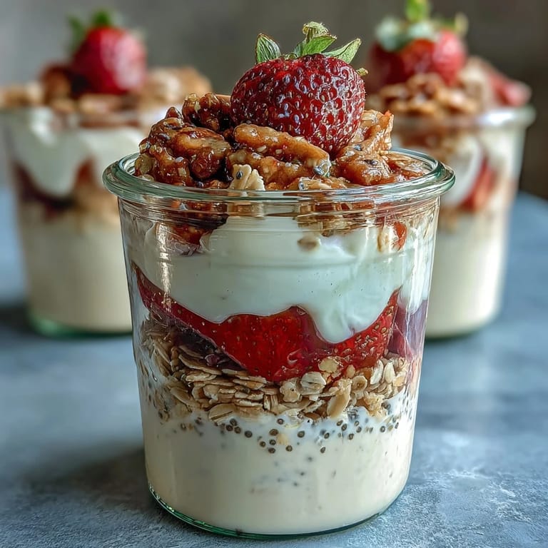 Save There's something almost magical about waking up to breakfast that's already waiting for you, ready to eat without any morning rush. I discovered overnight oats on a particularly chaotic Tuesday when I'd overslept and had exactly seven minutes before leaving the house—I threw together some oats, milk, and berries the night before out of pure desperation, and it became the most unexpectedly delicious rescue meal. Now, years later, I can't imagine starting my week without a jar of these creamy, fruity oats sitting in my fridge. The strawberries sink into the mixture just enough to sweeten everything naturally, while the chia seeds plump up and create this luxurious texture that feels indulgent for breakfast. It's genuinely one of those recipes that tastes like self-care but requires almost no effort.