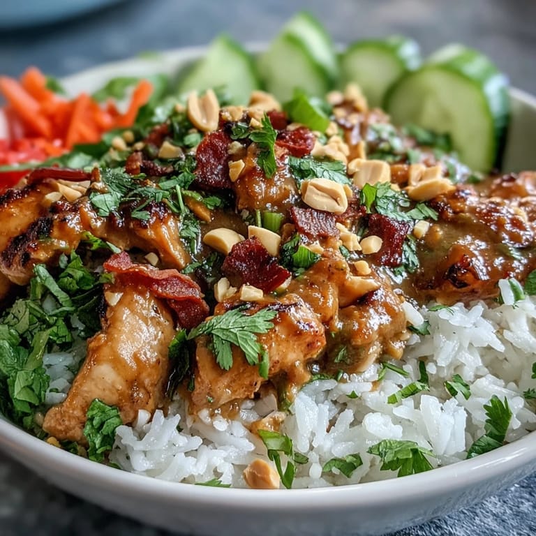Save My friend Sarah handed me a steaming bowl of this Thai peanut chicken during a rainy Tuesday afternoon, and I watched the steam rise off the coconut rice like it was carrying some kind of promise. She'd been talking about wanting to make something that felt fancy but didn't require a culinary degree, and somehow this bowl checked every box. The first spoonful was electric, and I realized right then that this was the kind of dish that makes people ask for the recipe before they've even finished eating.