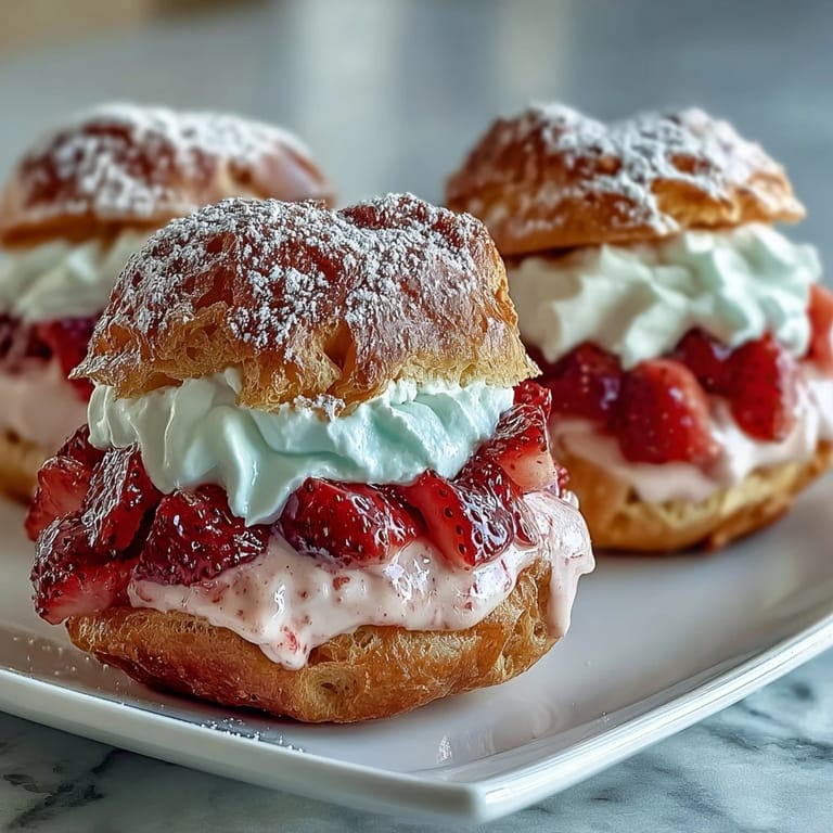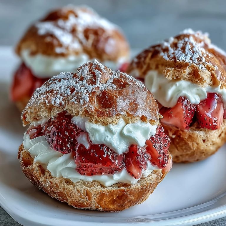 Save Delicate choux pastry puffs filled with luscious strawberry whipped cream and topped with a dusting of powdered sugar—perfect for a romantic treat or festive celebration.